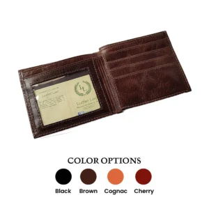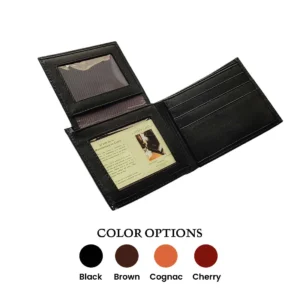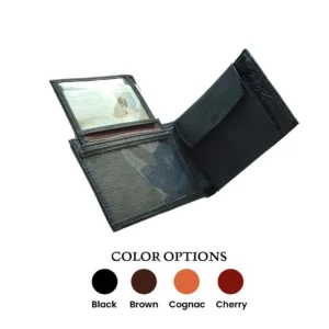 Billetera clásica para hombre, fabricada en cuero genuino. Espacios para billetes tarjetas y documentos de identificación. Diseño elegante y duradero por artesanos bolivianos.
